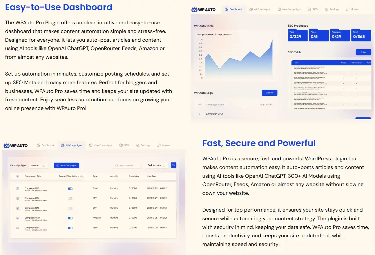 WP Auto Pro Plugin-এর সবথেকে বড় বৈশিষ্ট্য হলো এর এআই ইন্টিগ্রেশন। এটি OpenAI GPT, Gemini, Claude এবং OpenRouter-এর মতো ৩০০টিরও বেশি এআই মডেল সাপোর্ট করে। আপনি চাইলে খুব সহজেই এই মডেলগুলো ব্যবহার করে আপনার সাইটের জন্য ইউনিক আর্টিকেল বা ব্লগ পোস্ট জেনারেট করতে পারেন। এতে আপনার সময় বাঁচবে এবং সাইট সবসময় নতুন কন্টেন্টে আপডেট থাকবে। WP Auto Pro Plugin দিয়ে অটো ব্লগিং করা এখন আগের চেয়েও সহজ।